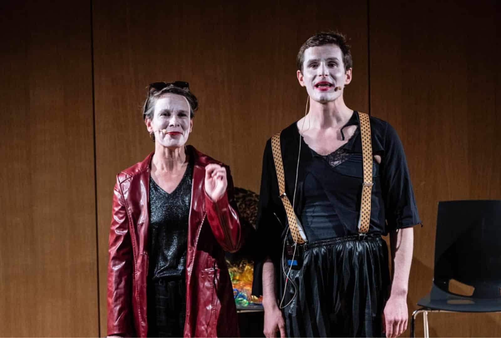 Eh bien, un peu tout cela à la fois. Lorsqu’on les annonce, Alexandre Pateau et la traductrice Peggy Rolland, le visage grimé de blanc, bondissent sur scène. Tenue intégralement noire et pour le moins surprenante, lèvres rouge vif, jeux de lumière, musique, et visages très expressifs préfigurant les rires à venir… Pendant une heure ou deux, ils se feront tour à tour comédiens, chanteurs, conférenciers et musiciens, avec Peggy Rolland au piano – alternant les séquences d’opéra chantées et les temps plus explicatifs, aidés en cela par un jeu d’accessoires minimaliste et ludique.